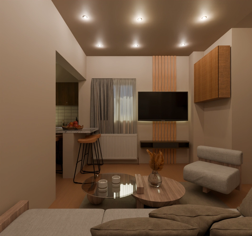 Στο εσωτερικό, ανακαινίστηκε πλήρως το μπάνιο με σύγχρονα υλικά, ενώ η κουζίνα και το σαλόνι ενοποιήθηκαν σε έναν φωτεινό, λειτουργικό χώρο με νησίδα.
