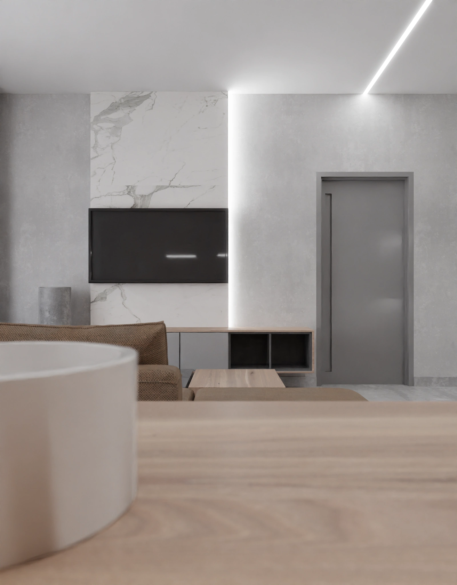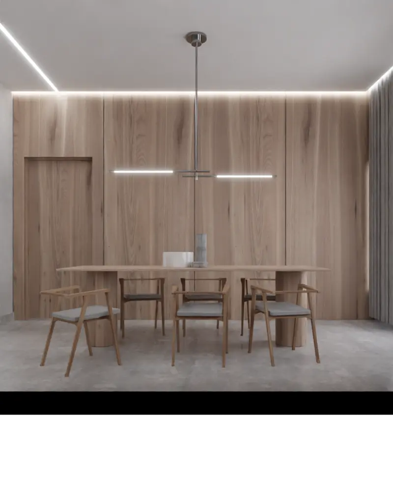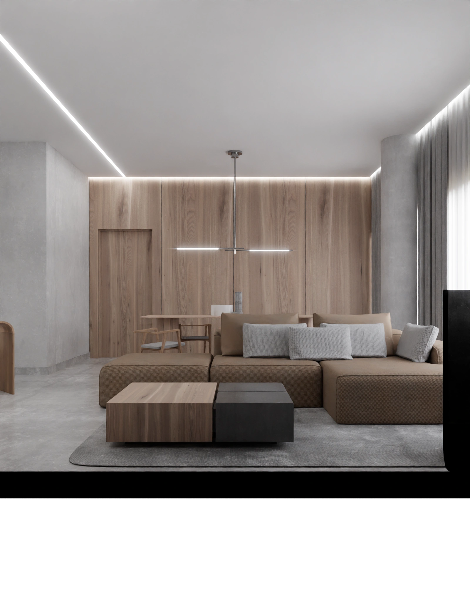 Φωτισμός: Η χρήση γραμμικού φωτισμού οροφής και διακριτικών φωτεινών επισημάνσεων ενισχύει τη γεωμετρία του χώρου και δημιουργεί μια ισορροπημένη ατμόσφαιρα.