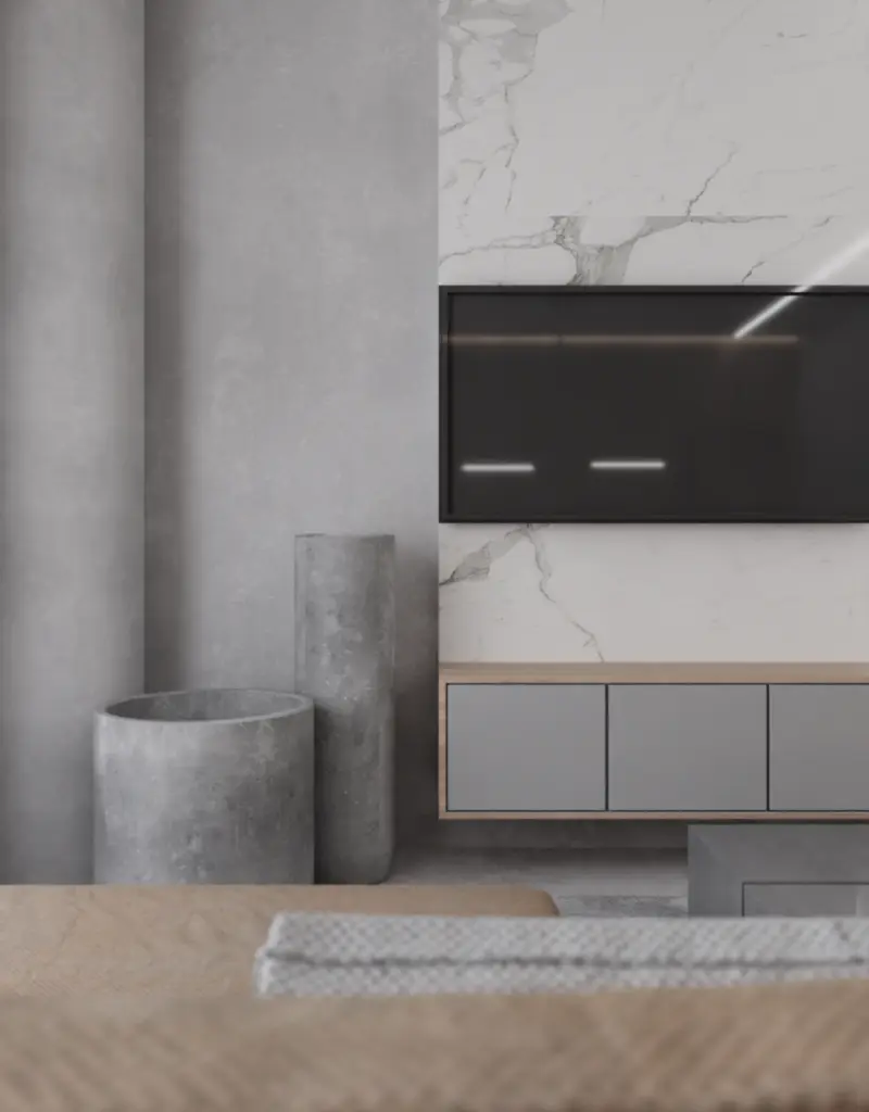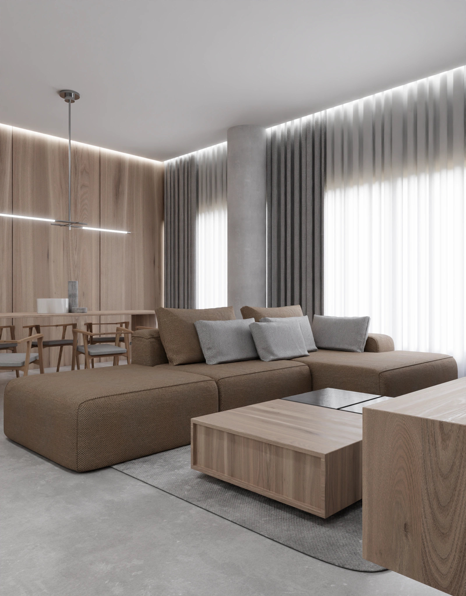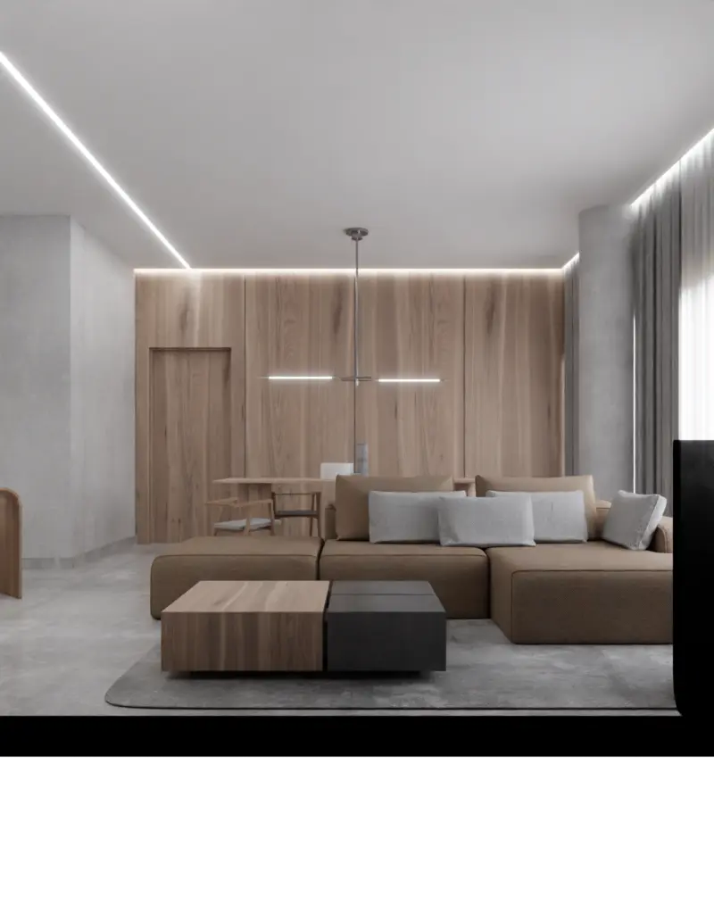 Υλικά & Υφές: Επιλέγονται φυσικές αποχρώσεις ξύλου σε συνδυασμό με γήινους τόνους και μοντέρνες επιφάνειες, προσδίδοντας ζεστασιά και κομψότητα στο σύνολο.