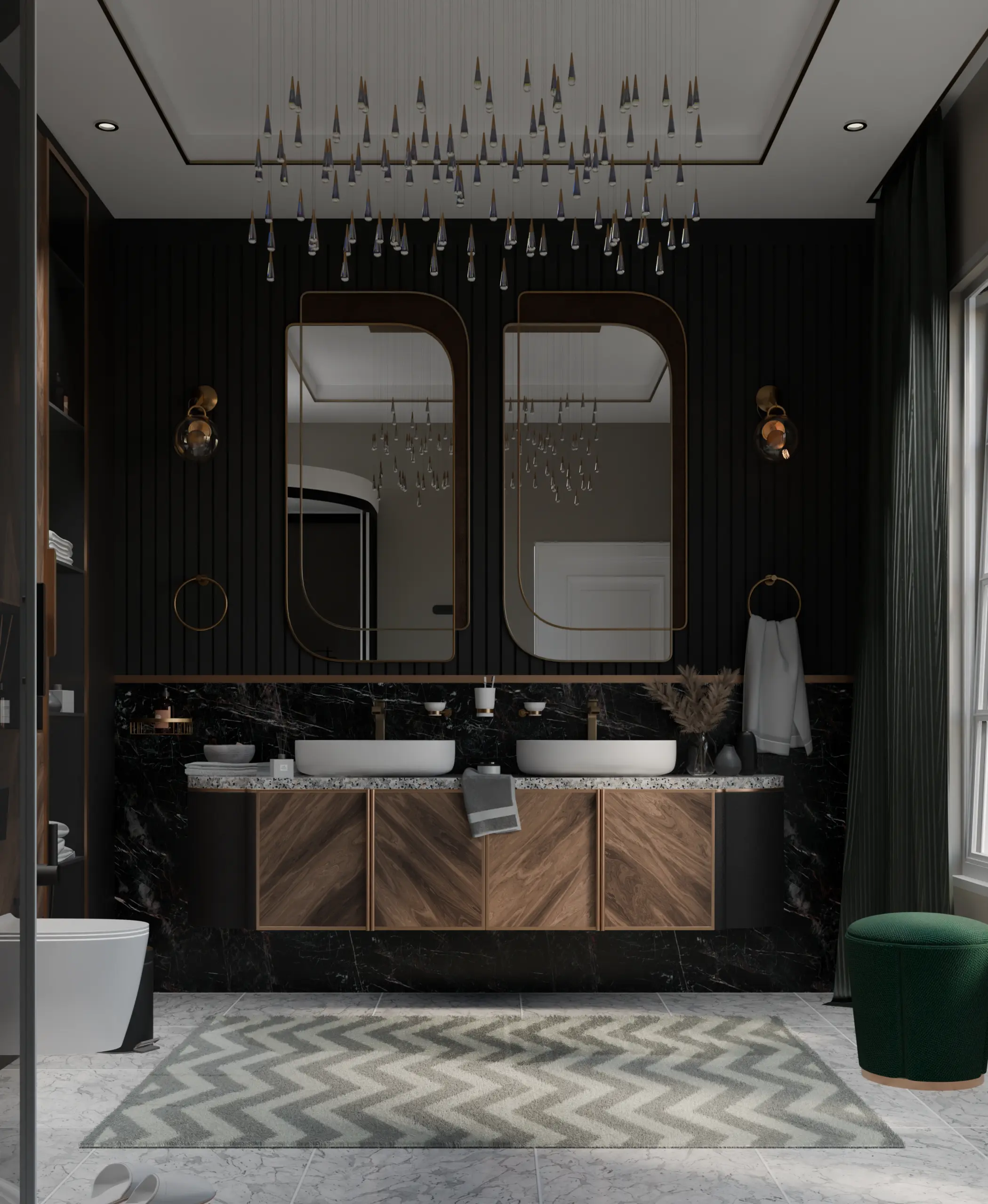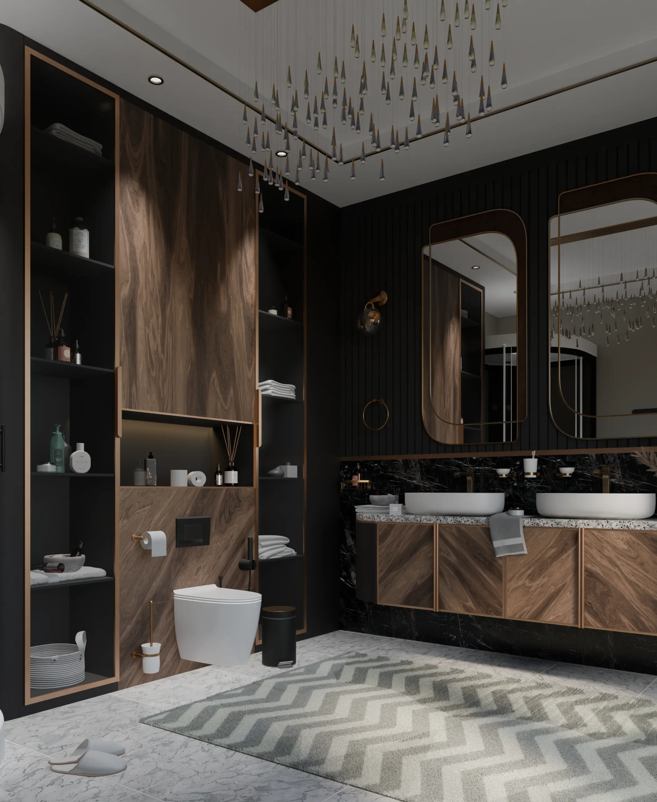 • Υλικά & Χρωματισμοί: Κυριαρχούν οι αποχρώσεις του μαύρου και του φυσικού ξύλου, σε συνδυασμό με μαρμάρινες επιφάνειες, δημιουργώντας έντονη αντίθεση και αίσθηση κομψότητας.