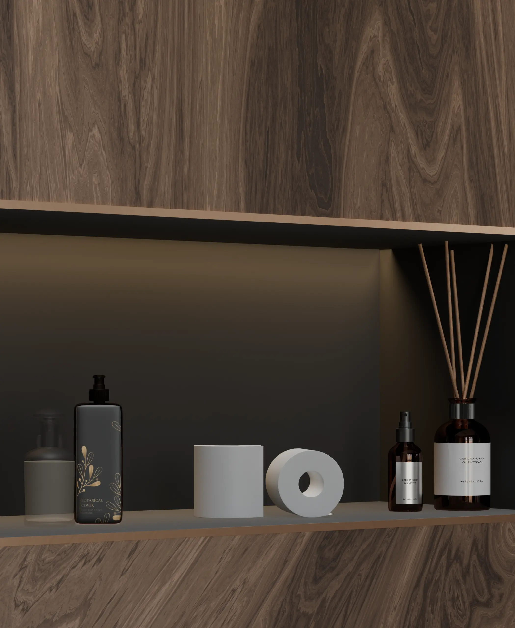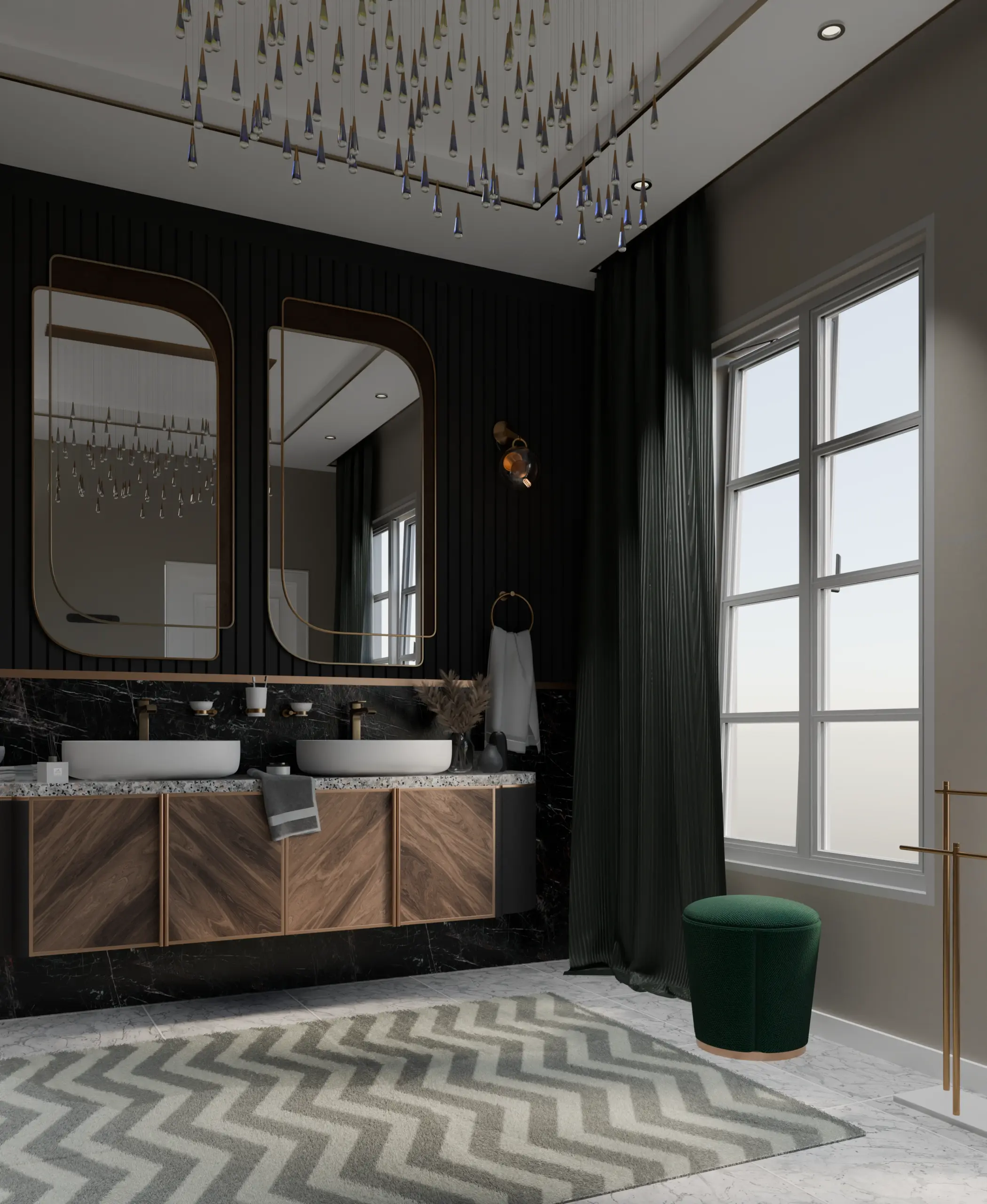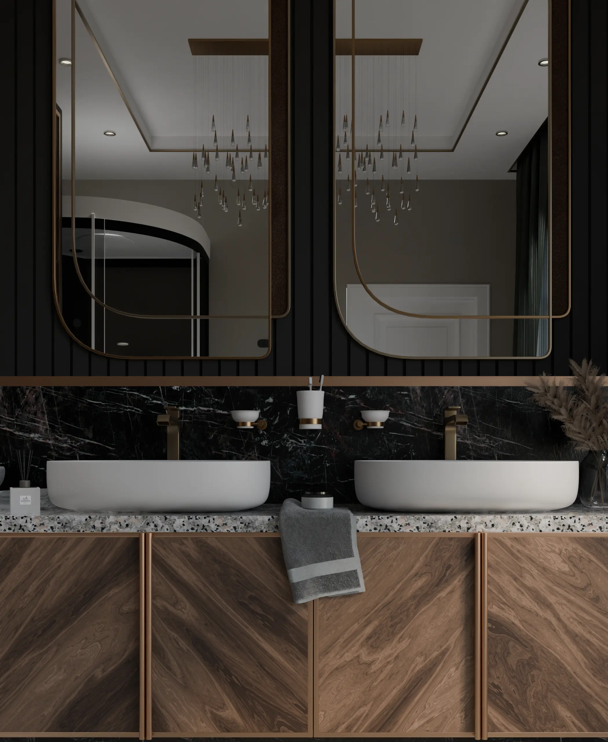 • Διαρρύθμιση & Εργονομία : Ο χώρος οργανώνεται με διπλό νιπτήρα, εργονομικές αποθηκευτικές λύσεις και διακριτικό φωτισμό που αναδεικνύει τα υλικά.